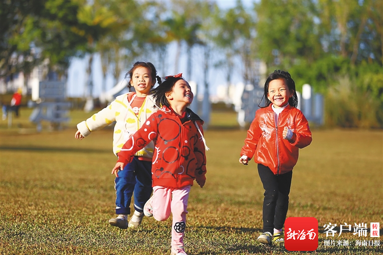 1月12日、13日,海口天氣轉晴。圖為12日幾位小朋友在海口市鳳翔濕地公園玩耍。