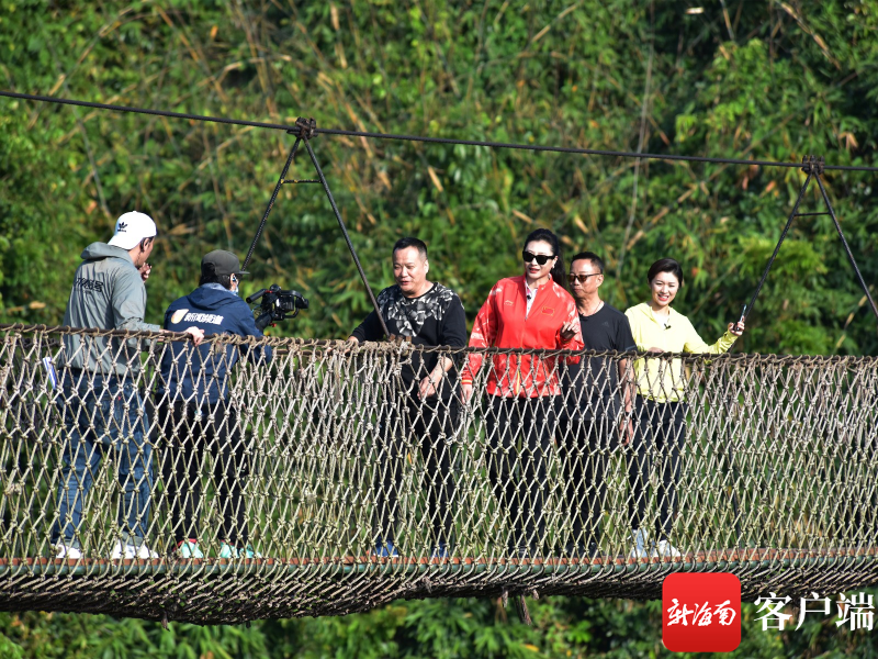 當日,攝制組一行,先后在該景區山頂公園的熱帶雨林棧道、煙波亭、過江龍索橋上取景拍攝。亞龍灣熱帶天堂森林旅游區,優美的熱帶雨林自然生態風光,深受攝制組的青睞。