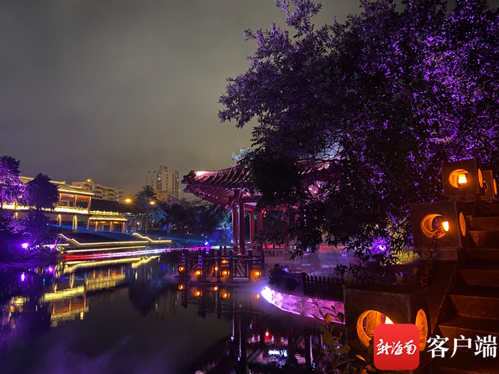 1月31日晚,記者在五公祠園區看見,亮燈一刻,全園燈光照亮了瓊臺福地的夜空,也照亮了五公祠內古色古香的文物古跡。五彩的燈光交織變換,水霧繚繞,猶若置身仙境。漫步在園區小路,感受清風徐來,看湖光相映、橋影波光,斑斕倒影搖曳水中,在光影中重溫歷史文化,在行游中享受探索之樂。古老的五公祠,在月夜下煥發著新生活力。