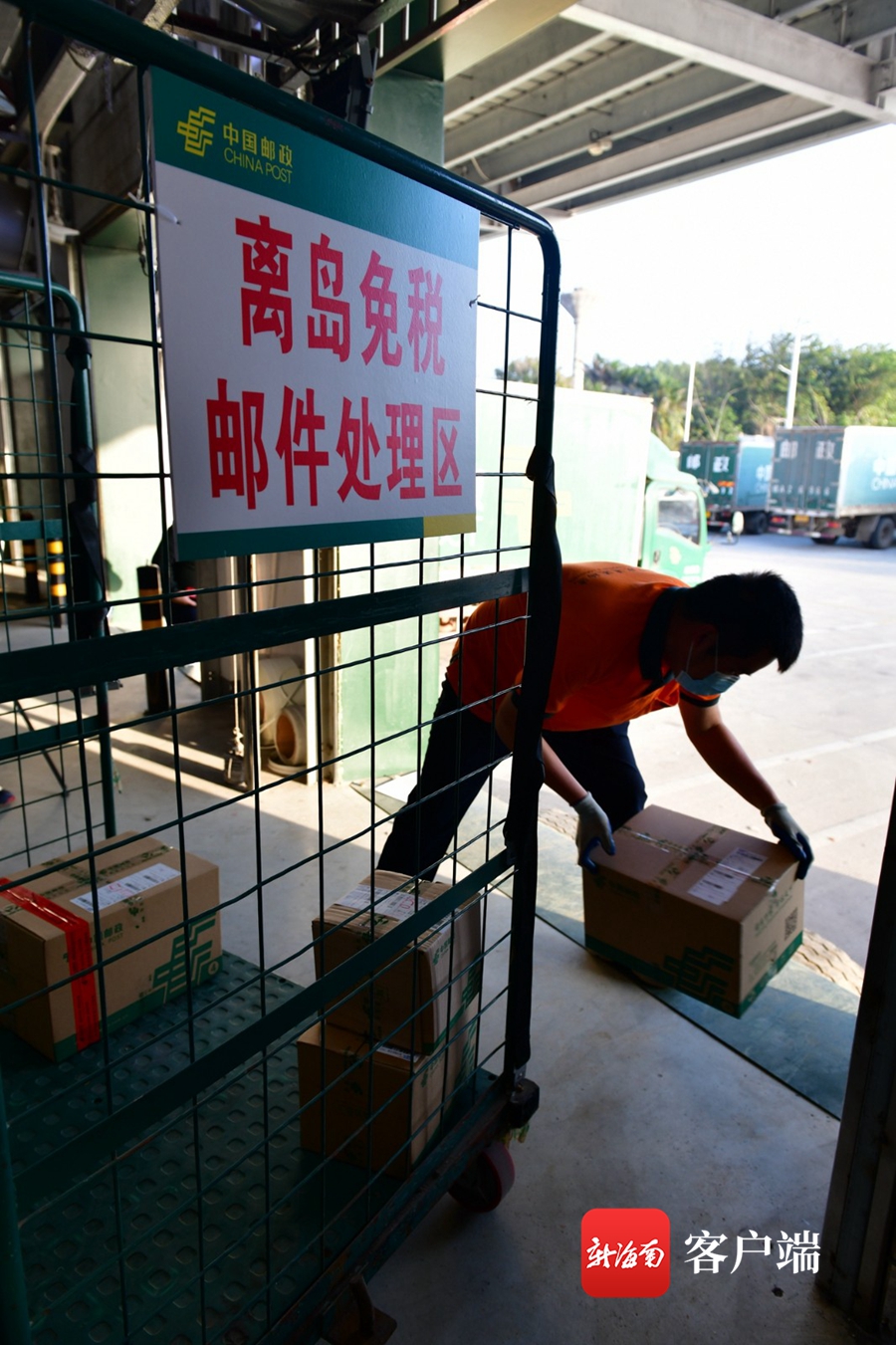 打包完成后,這些免稅商品會被送至位于永安路的海口郵區(qū)中心局郵件處理中心進行分揀,記者看到,處理中心設(shè)有專門的免稅處理區(qū)。17時40分許,郵政車到達后,跟車人員與分揀人員當場驗收核對貨品數(shù)量和外包裝,并用郵袋將其一一裝好進行安檢。