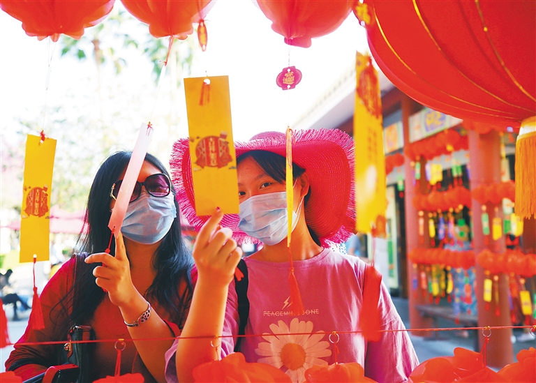 2月12日,游客在三亞南山文化旅游區(qū)猜燈謎,感受民俗文化。(海南日報記者 武威 特約記者 陳文武 圖/文)