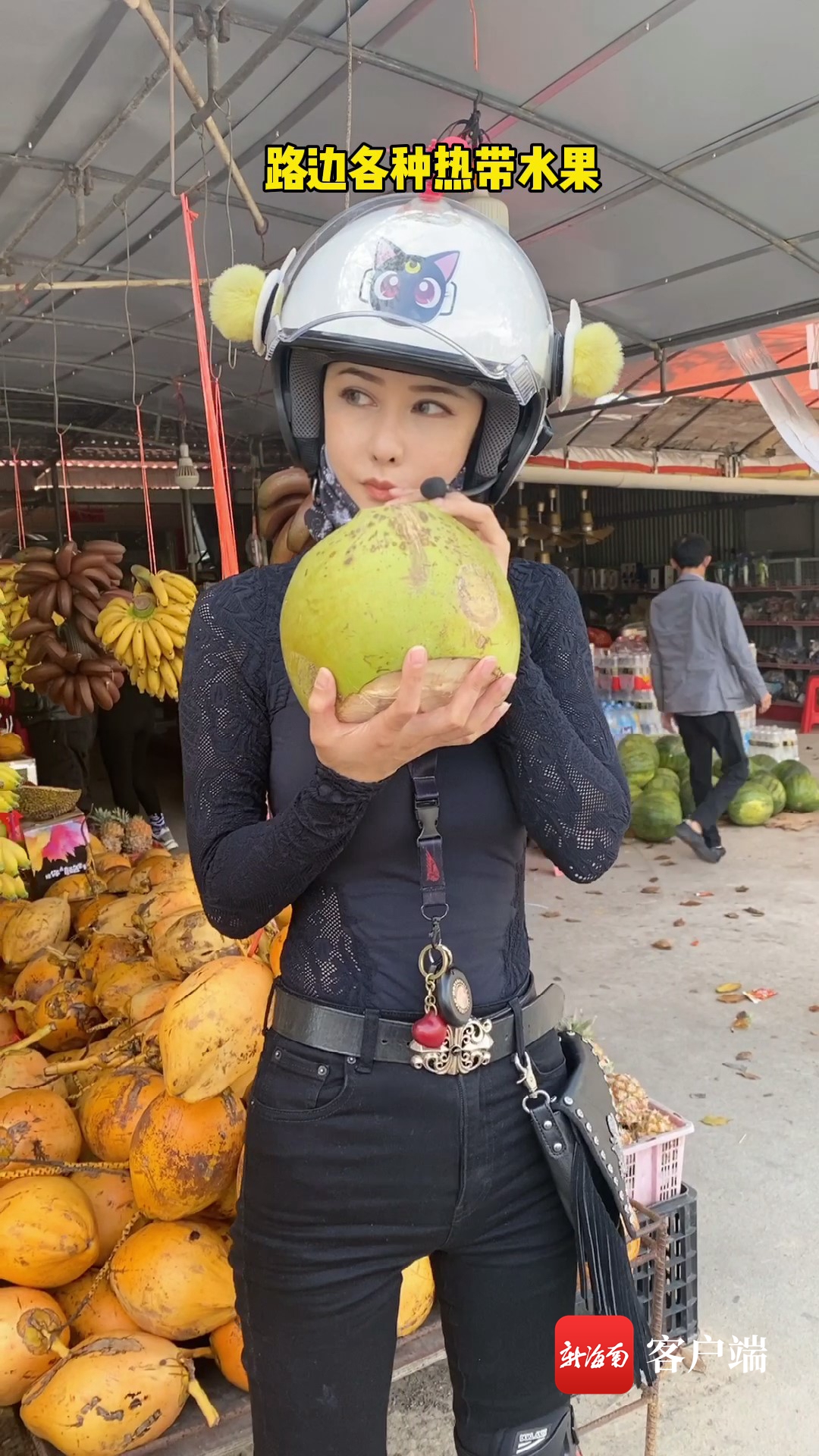 盟主安全官在路邊喝椰子。