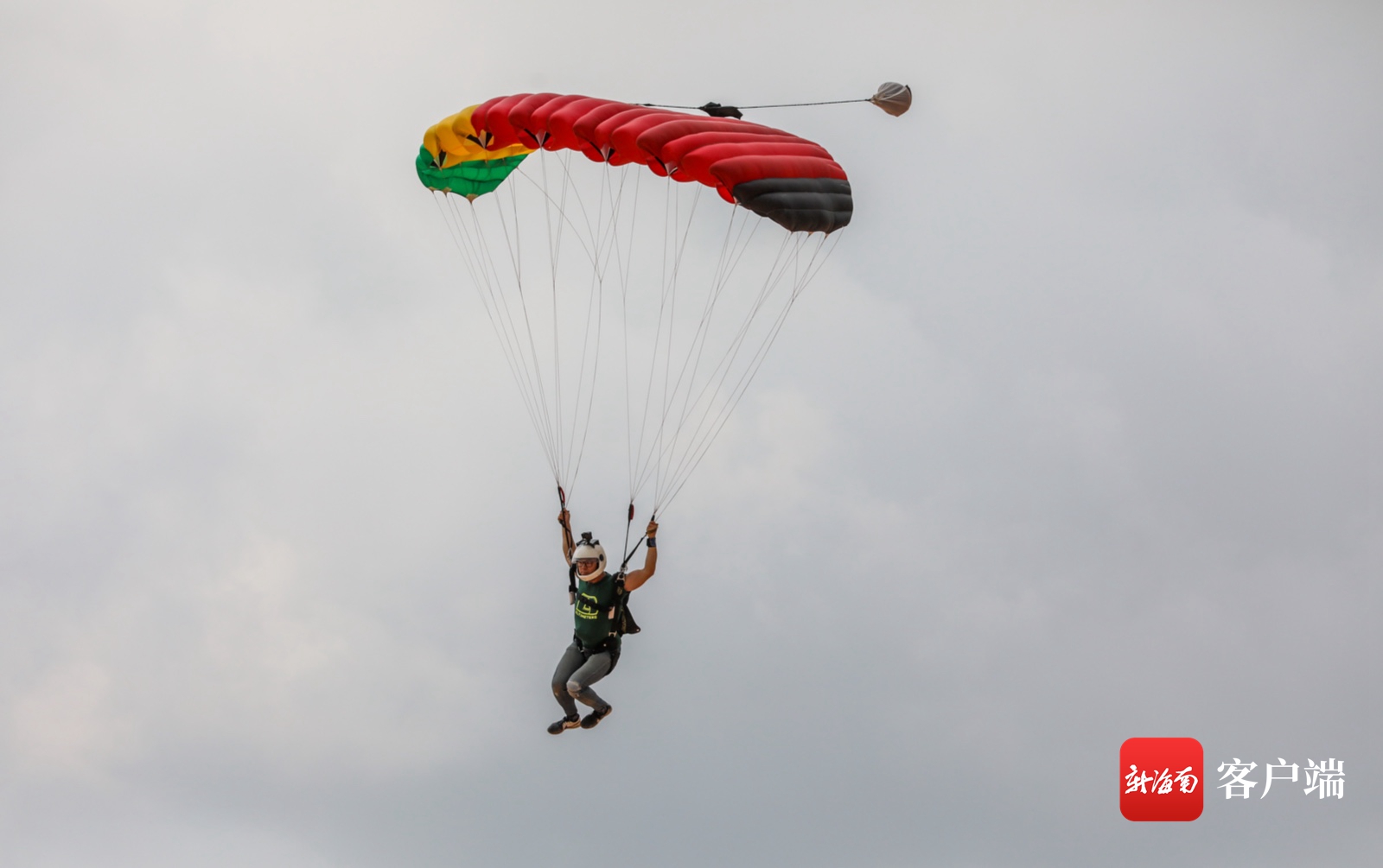發布會現場,專業跳傘教練現場進行了精彩刺激的定點跳傘首飛表演。記者 李昊 攝