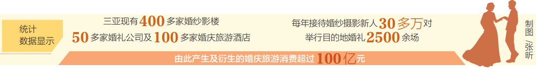 從上世紀90年代開始,三亞不斷深挖“甜蜜金礦”,做大“幸福產業”,成為海南婚慶產業發展的“前沿地”。三亞市婚慶旅游行業協會會長許偉介紹,目前三亞婚慶產業主要由婚紗攝影、婚禮服務、蜜月度假和免稅購物四大板塊組成,“目的地婚禮”理念越來越深入人心。