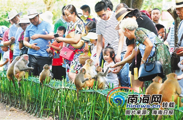 陵水南灣猴島生態旅游景區,游客與野生獼猴親密接觸。海南日報記者 王凱 攝