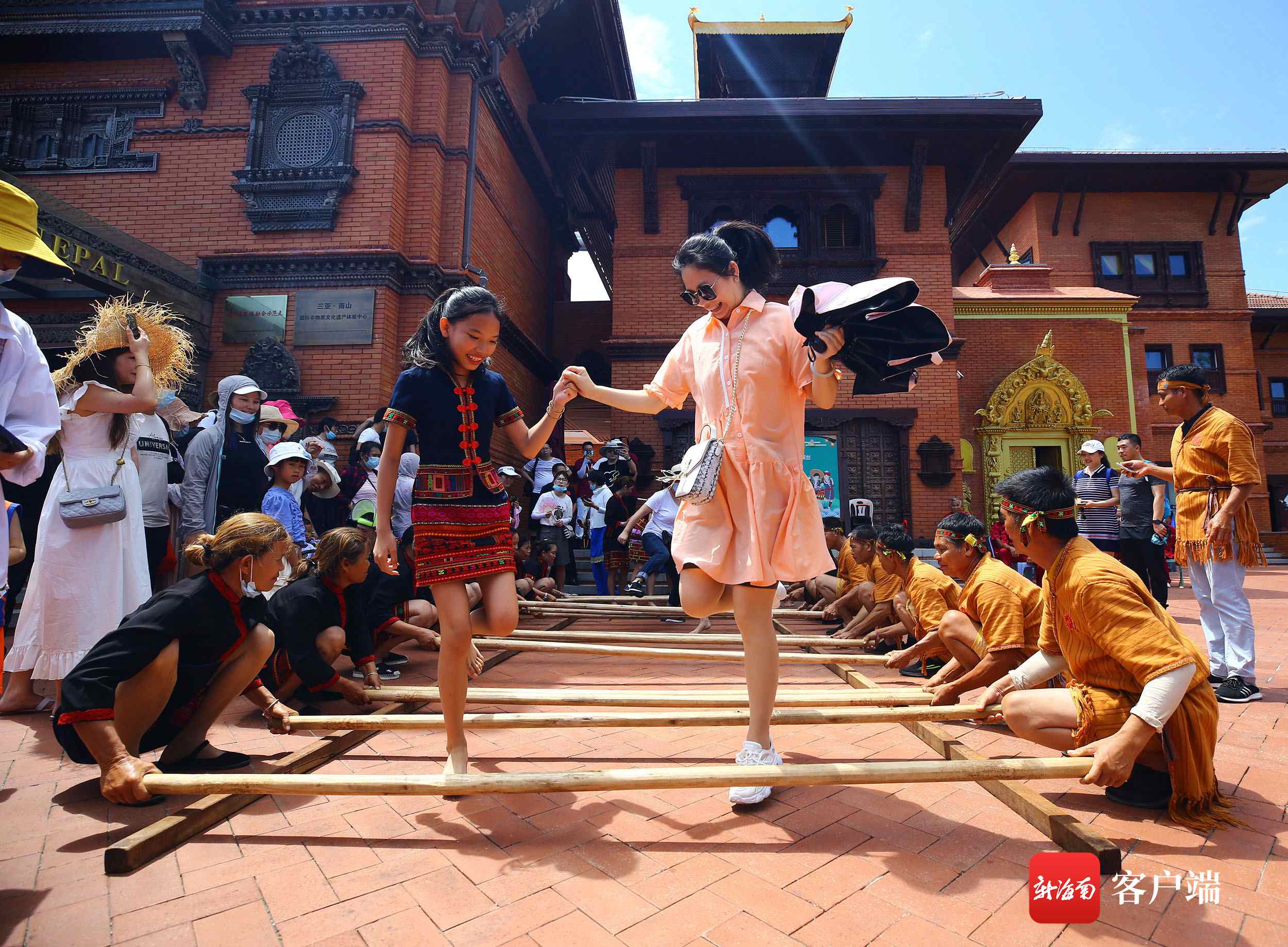 5月2日,游客在三亞南山景區跳竹竿舞。記者沙曉峰 通訊員 陳文武攝