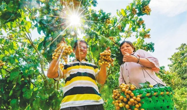 六月初,海南黃皮漸漸從青綠色變成金黃色,喜愛黃皮的人很快能大快朵頤了。在民間,黃皮果有“果中之寶”的稱號,果肉酸甜可口、鮮嫩多汁,營養價值也很高,還可幫助消化、清熱化淤、止咳清痰。“海南黃皮看儋州,儋州黃皮看大成,大成黃皮看南吉”,儋州市大成鎮推賽村南吉村現有6000株黃皮樹,掛果的達3400株,百年以上的老樹有300多株。自古以來,南吉村居民就有在房前屋后種植黃皮的歷史,得天獨厚的氣溫、降水、土質,成就了南吉黃皮優良的品質。
