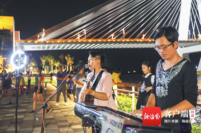 傍晚,一抹抹晚霞在世紀大橋映襯下,"落"在海口灣里,勾勒出令人陶醉的椰城美景,霓虹閃爍,酒館微醺,清吧里,吟游的歌者,步道上,打卡拍照的游人,還有街頭藝人的熱鬧喧囂。