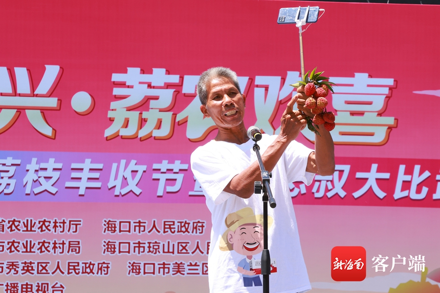 活動現場,10位“荔志叔”身穿火山荔枝主題文化T恤、手拿特色小道具,分別登臺展示自家種植的優質荔枝,用登臺“走秀”、個性化“比武宣言”的方式,上演了精彩熱鬧的海口“荔志叔”風采秀,分享荔枝豐收的喜悅,展現新時代海口“新農人”風采。