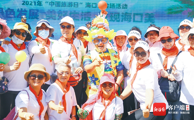 5月19日,參加“中國旅游日”海口分會場活動的游客在現(xiàn)場合影。本報記者 張茂 攝