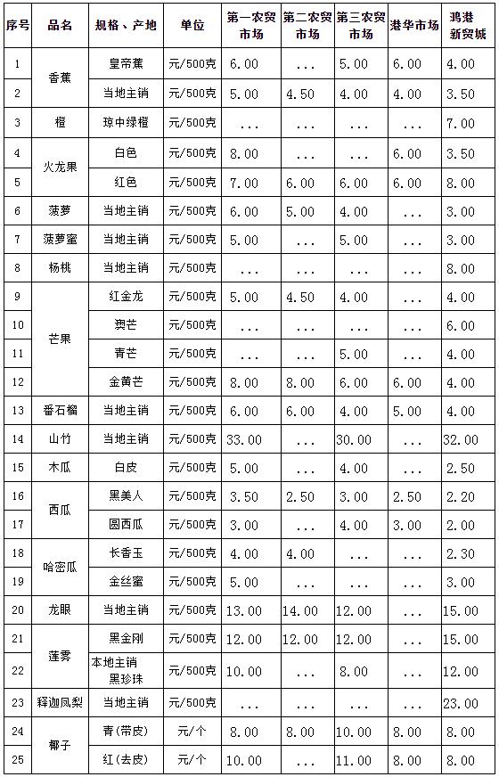 ?三亞市常見熱帶水果零售價格表