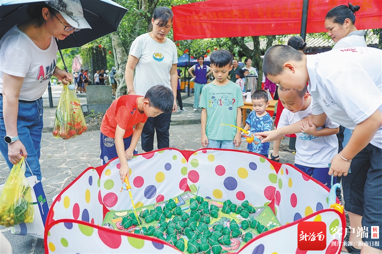 六月十三日,在海口火山口公園,家長帶孩子體驗釣“粽子”游戲。海南日報記者 李天平 攝