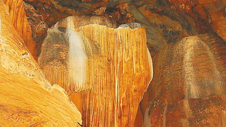 石花水洞中的卷曲石、文石花、方解石晶體花被稱為“一石二花”,是國(guó)家級(jí)珍品。尤其是卷曲石,生長(zhǎng)在非常濕潤(rùn)的封閉環(huán)境中,非常難得,對(duì)研究地質(zhì)具有不可忽視的作用。石花水洞里的卷曲石已經(jīng)被國(guó)家博物館采用收藏,并被相關(guān)地質(zhì)專家進(jìn)行研究。更令人驚嘆的是,在石花水洞中,存活著極為珍貴的國(guó)家級(jí)保護(hù)動(dòng)物娃娃魚。娃娃魚是由3億6千萬(wàn)年前水生魚類演變而成的兩棲類動(dòng)物,它見證著石花水洞的悠久歷史。