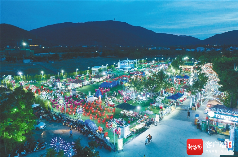 說話間,一輛輛小推車發出哐哐當當的聲音由遠及近,越來越多的村民準備營業。夜幕降臨,博后夜市張燈結彩,人頭攢動,百余個攤位有序排開,傳統手工藝品、黎族特色織品等商品琳瑯滿目。三五成群的游客涌進夜市,被應季水果、海南小吃、海鮮燒烤等特色美食“俘獲”。