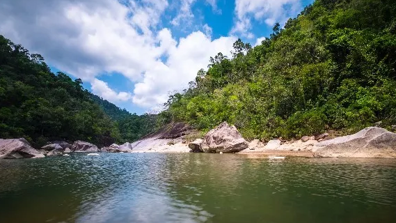 自然保護區中的紅水河谷,長不過1萬米,落差高達1500多米,兩岸陡坡峭壁,常有雨林樹木,偶見群猴跳鬧枝頭;河底遍布石頭,石面平滑光潔,石間山泉潺流,多有池潭瀑布,景色秀麗,是森林探險、回歸自然生態游的好去處。