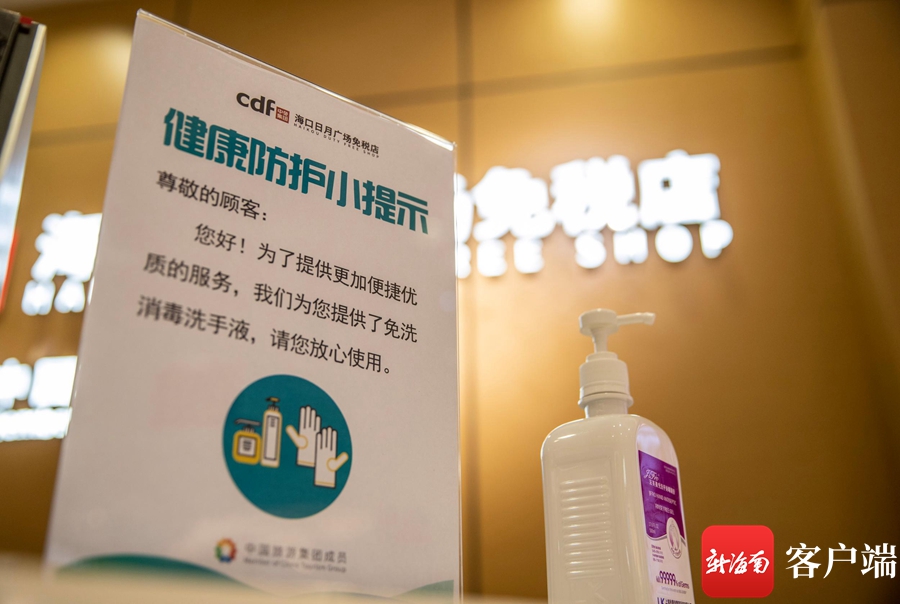 免稅店在多個位置放置免洗消毒洗手液供消費者使用。記者 劉洋攝