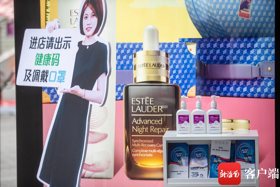 免稅店要求全店工作人員每日定時體溫檢測并實施健康監測,工作期間佩戴口罩和手套,門店定時對整個公共區域進行全面消毒,此外,店內專柜設置了一米欄保證顧客合理間隔有序地排隊購物,店內所有收銀臺和服務臺都放置免洗消毒洗手液供客人使用。