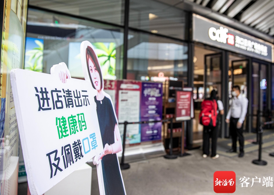 中免集團??谌赵聫V場免稅店出入口設置醒目的提示牌。記者 劉洋攝