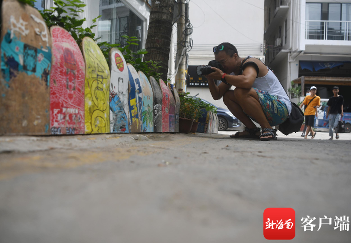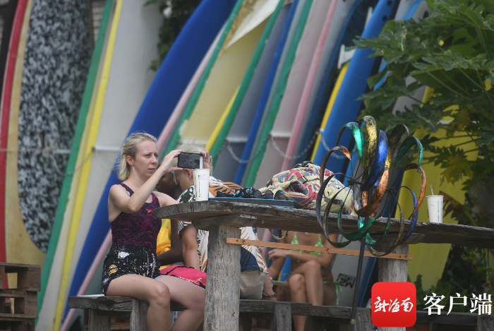 8月11日,一位外國游客在三亞后海拍照打卡。記者 沙曉峰攝