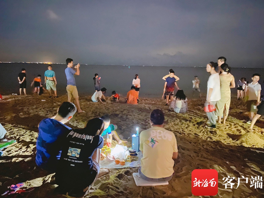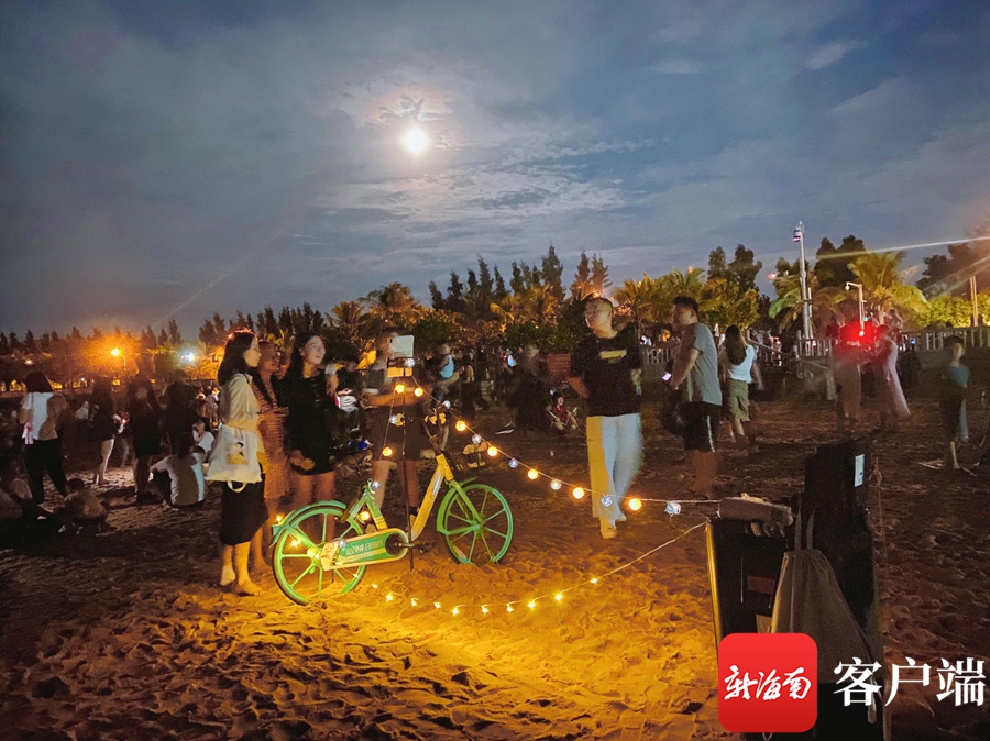 晚上,海口白沙門公園的沙灘在星星燈光的照射下,讓海邊的中秋之夜變得浪漫了,也熱鬧非凡。記者在現場看到,許多市民在海邊的沙灘上搭起帳篷和野餐布,擺出月餅,一邊賞月,一邊吹海風玩耍。現場還有不少年輕人擺起音響和話筒,愉快演唱。