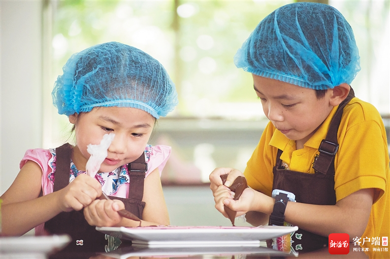 小游客在興隆熱帶植物園動(dòng)手做巧克力。海南日?qǐng)?bào)記者 袁琛 攝
