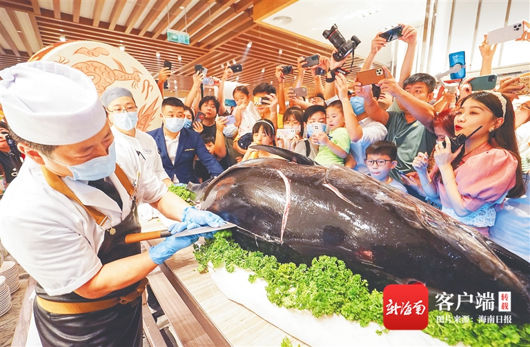 當天18時18分許,在輕快歡樂的鼓點聲中,重達200斤的大型金槍魚開魚儀式更是讓現場賓客大開眼界。“我張開雙手都沒有這條大魚長呢!”活動現場,6歲菁菁伸開雙臂,開心地和眼前的金槍魚合影。不一會,慕名前來的游客把開魚現場圍得水泄不通,站在后排的人們紛紛踮起腳尖舉著手機、相機拍照留念。