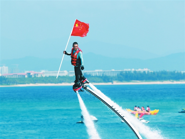 10月1日,三亞蜈支洲島旅游區(qū)水上飛龍表演。 三亞日?qǐng)?bào)記者 陳聰聰 攝