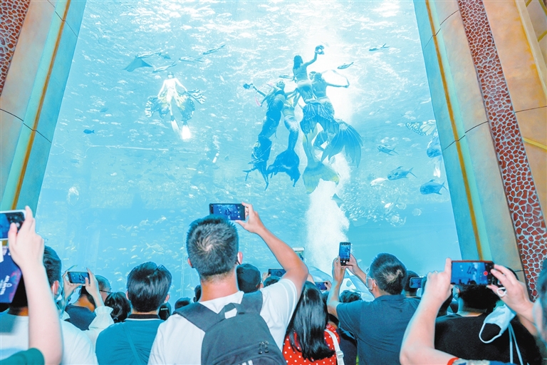 10月3日,游客在三亞·亞特蘭蒂斯失落的空間水族館觀看美人魚表演并用手機(jī)記錄精彩瞬間。 三亞日?qǐng)?bào)記者 陳聰聰 攝