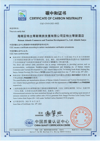 新海南客戶端、南海網(wǎng)、南國(guó)都市報(bào)11月4日消息(記者沙曉峰 )近日,經(jīng)由中國(guó)質(zhì)量認(rèn)證中心(CQC)進(jìn)行碳核查,復(fù)星旅文·三亞亞特蘭蒂斯完成了2021年4-6月份能源消耗所產(chǎn)生溫室氣體排放量的碳中和,達(dá)成CQC碳中和認(rèn)證,并獲得由中國(guó)質(zhì)量認(rèn)證中心(CQC)簽發(fā)的碳中和證書,該證書也是海南省旅游業(yè)企業(yè)獲得的首張?zhí)贾泻妥C書。