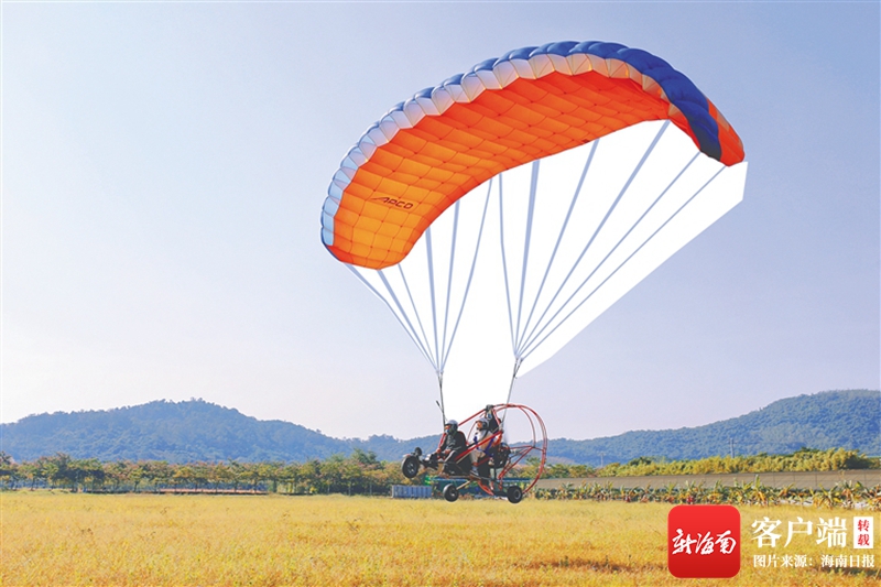 在陵水黎族自治縣紅角嶺航空飛行營(yíng)地,游客們?cè)诮叹毜膸ьI(lǐng)下,助跑、加速、騰空,即可在滑翔傘帶動(dòng)下翱翔于空中,一覽蔚藍(lán)無(wú)垠的大海、郁郁蔥蔥的綠野和錯(cuò)落有致的村落,美不勝收。