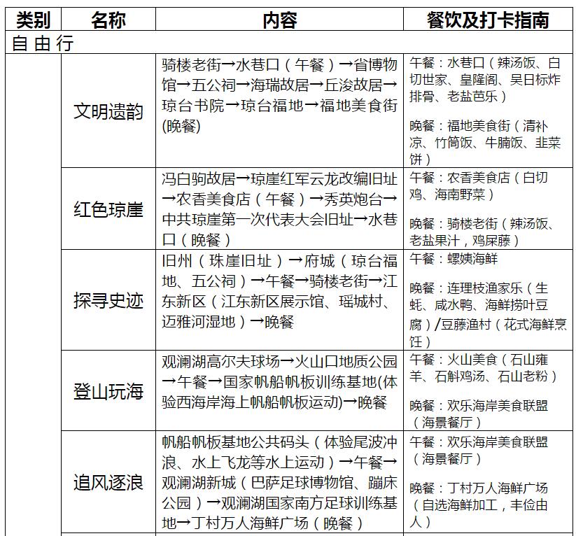 海口市旅行社協(xié)會(huì)秘書(shū)長(zhǎng)麥偉文介紹,海口旅文局此次結(jié)合常態(tài)化疫情形勢(shì)下旅游消費(fèi)市場(chǎng)需求變化,針對(duì)游客群體中的青年群體、女性群體、商旅人士和家庭群體,圍繞海口火山、海岸等自然資源和騎樓等人文資源,推出歷史文化游、體育運(yùn)動(dòng)游、都市休閑游、美景美食游、網(wǎng)紅打卡游、親子研學(xué)游、美麗鄉(xiāng)村游和特色購(gòu)物游等八大專題自由行線路(含一日游、二日游、三日游)共23條。市民游客可根據(jù)時(shí)間及需求組合安排,把一日游組合成兩日游、三日游的線路也達(dá)百余條。每一個(gè)主題線路都是以海口資源情況和不同年齡層次游客需求深入剖析后作出的包裝規(guī)劃。