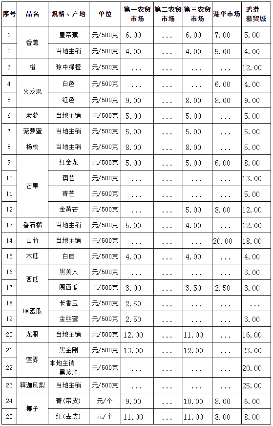 ?三亞市常見熱帶水果零售價(jià)格表