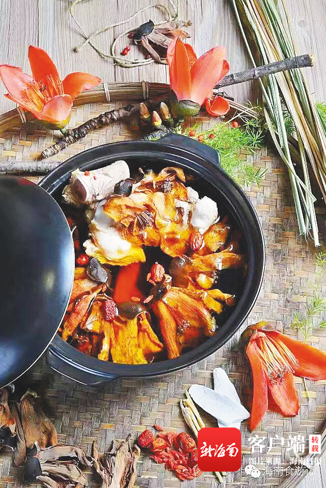 細數之下,才驚訝地發現,原來這么多花已經進了海南人的湯鍋:晾干的木棉花,燉煮豬骨,加薏米、白果、姜片,清新爽口;穗子般的檳榔花,用來燉雞,放入姜片和紅棗,一直燉到肉質軟爛,骨架松散,撒點鹽便可出鍋……
