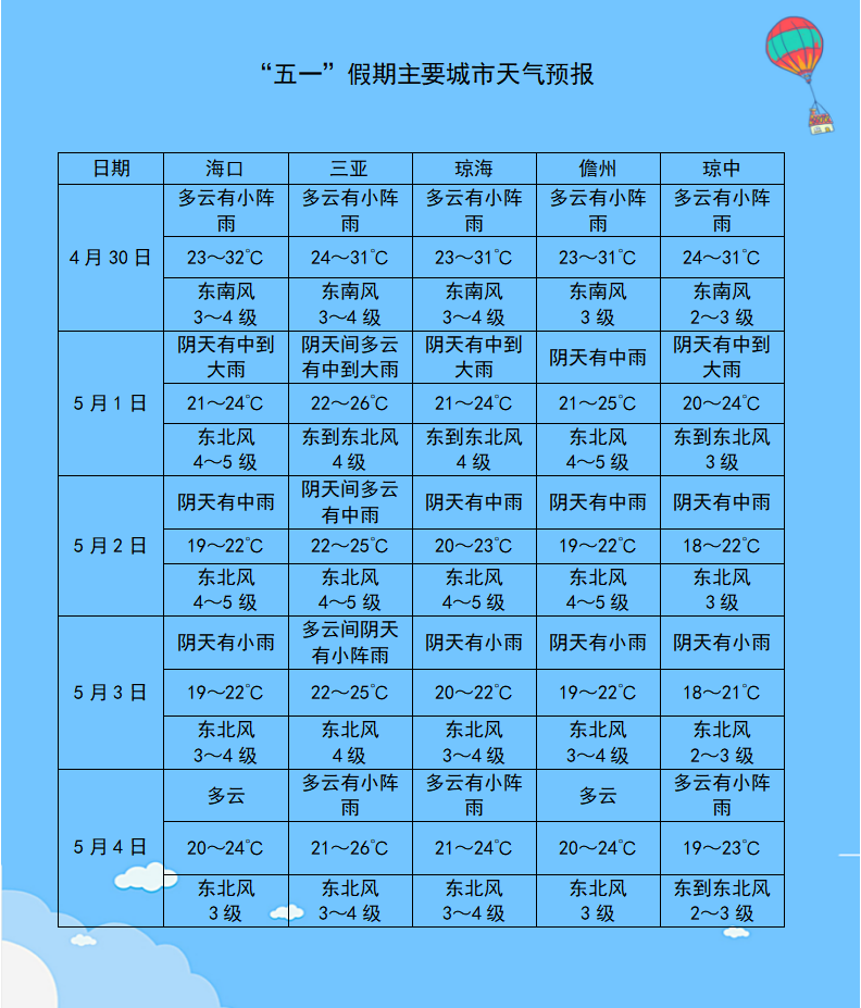 其中,“五一”假期(4月30日~5月4日),海南島降雨較多,總體對假日出行及戶外活動有一定影響。