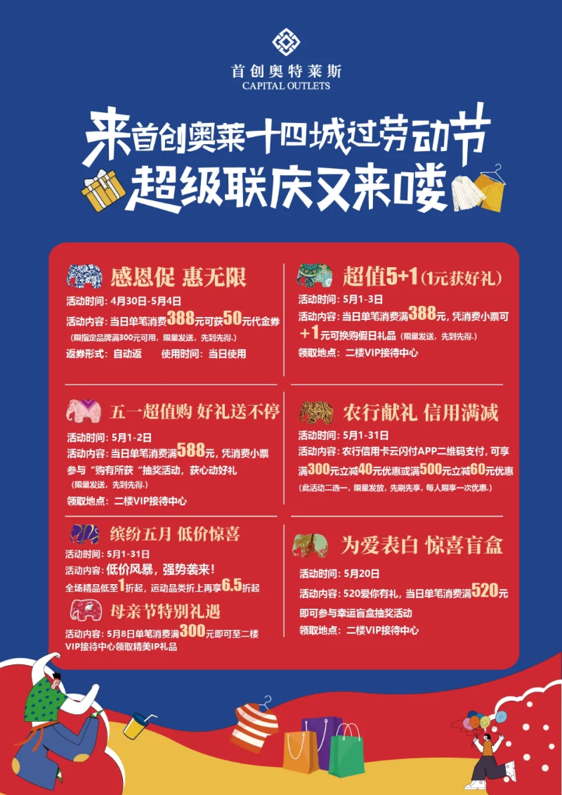 萬(wàn)寧首創(chuàng)奧特萊斯精心策劃了“五一超值購(gòu) 好禮送不停”“感恩促 惠無(wú)限”“超值5+1(1元獲好禮)”等一系列主題活動(dòng),各大品牌也趁勢(shì)推出眾多折扣福利,給市民游客們提供超值的優(yōu)惠體驗(yàn)。
