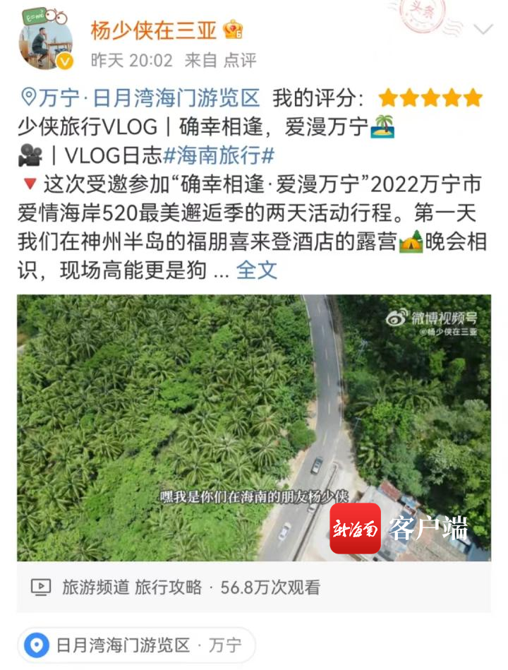 旅游達人“楊少俠在三亞”在參加過活動后,對萬寧的美景給出了5星好評,在他的vlog中,第一晚酒店露營,大家在晚會相識,現場高能更是狗糧不斷。第二天去了沖浪勝地日月灣,“萬寧的海簡直美如畫”,下午的婚紗走秀更是將活動主題升華到了每個人的記憶里。豐富的活動內容加上精良的制作,單條vlog的播放量就達到了56萬次。