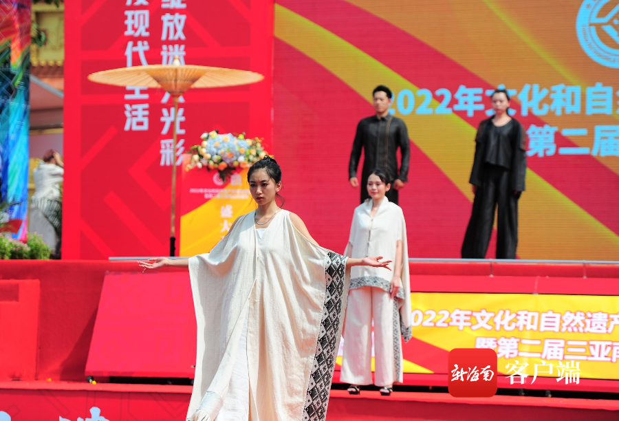 開幕式上,第一批國家級非物質文化遺產保護名錄項目——崖州民歌《梁生求學上常州》,通過熱情的曲調,吟唱出人們對生活的熱愛,傳遞著崖州古韻新的生命。黎族竹木器樂《黎家春來早》和原生態黎族民歌《從那籬笆過》讓八方賓客感受到海南黎族同胞的熱情,展現了海南源遠流長、極具特色的民族文化和非遺技藝。在黎錦時裝秀上,模特們身穿著結合現代曲線美和黎族特色的服裝緩緩走出,通過傳統文化和時尚潮流的交融,一展黎錦的藝術之美與生活氣息。