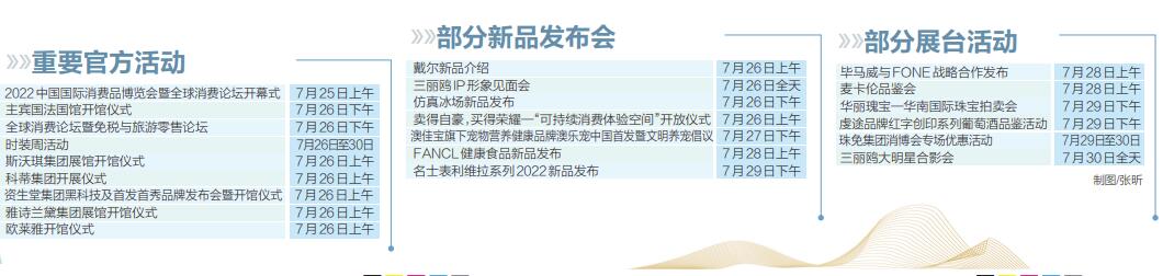 7月25日至7月30日,本屆消博會期間系列活動、論壇、展銷精彩紛呈。來自國內(nèi)外的2800多個品牌參展、200多個品牌的600多個全球新品首發(fā)首秀;線上線下舉辦100余場論壇活動,探討未來消費形勢,洽談供采合作;各展館展區(qū)將有美食品鑒、網(wǎng)絡(luò)直播、新品體驗、游戲互動、明星合影、美妝授課等多種互動活動,促進展銷采購匹配。