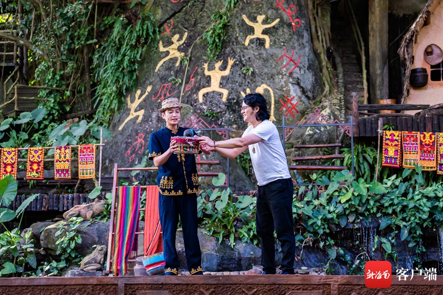 10月31日,在海南檳榔谷黎苗文化旅游區(qū)表演舞臺(tái)上,演員與散文家胡竹峰(右)互動(dòng)。記者 李昊 攝