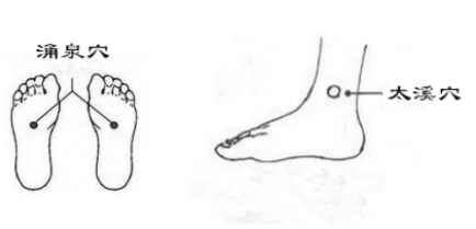 太溪穴是足少陰腎經(jīng)的輸穴、原穴,位于足內側,內踝后方,內踝尖與跟腱之間的凹陷處,有滋腎陰、補腎氣、壯腎陽、理胞宮的作用。涌泉穴是腎經(jīng)的井穴,位于足底卷足時足前部凹陷處,有瀉熱、鎮(zhèn)靜、安神的作用。按摩方法是,一次按壓30下,手指按揉,以微感酸痛為度。
