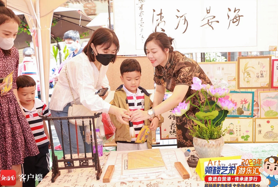 率先登場的海南省農墾總局機關幼兒園教育集團,主推“膠娃逐夢海南情 中華傳承潤童心”,用一幅幅描繪海南自貿港、中國航天情、黎村苗寨民族風情、熱帶自然景觀和墾區文化的親子畫作,將孩子們心目中的中國人民幸福生活場景展現出來,吸引了不少過往市民游客駐足觀賞。