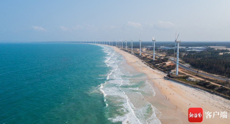 在文昌木蘭灣沿海,連排的風力發電機形成一道獨特的風景,一側的環島旅游公路也已初現形態。記者 李昊 攝