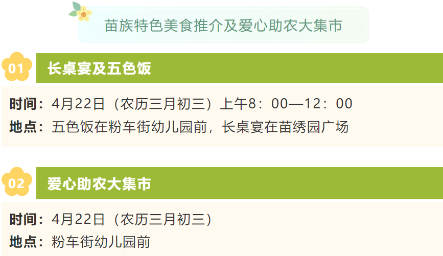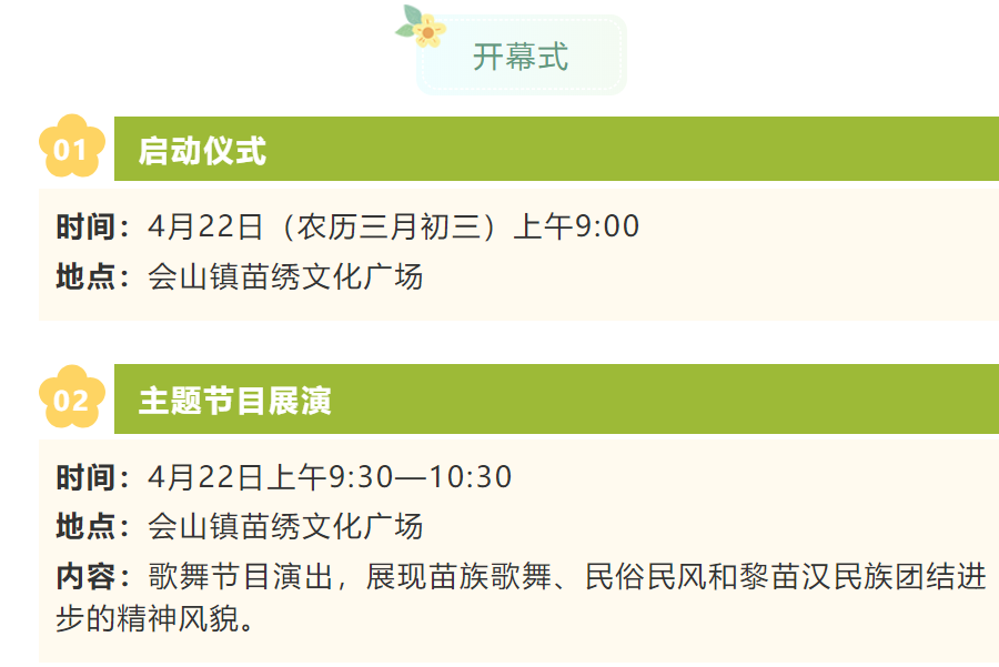 4月20日晚上,活動將首先在會山鎮苗繡文化廣場拉開傳統瓊劇會演,4月21日至22日,將舉行民族文藝表演、文藝晚會以及眾多民間競技活動和男子籃球半決賽、決賽。活動重頭戲開幕式將于4月22日(農歷三月初三)上午9點在會山鎮苗繡文化廣場舉行。開幕式后將在現場舉行歌舞節目演出,展現苗族歌舞、民俗民風和黎苗漢民族團結進步的主題節目展演。開幕式當天還將舉行苗族特色美食推介及愛心助農大集市,以及黎族苗族特色文化展、苗族文化交流會、政策宣傳活動展等豐富多彩的活動。