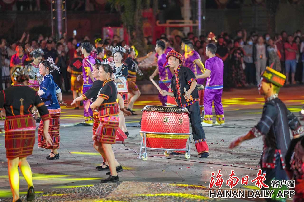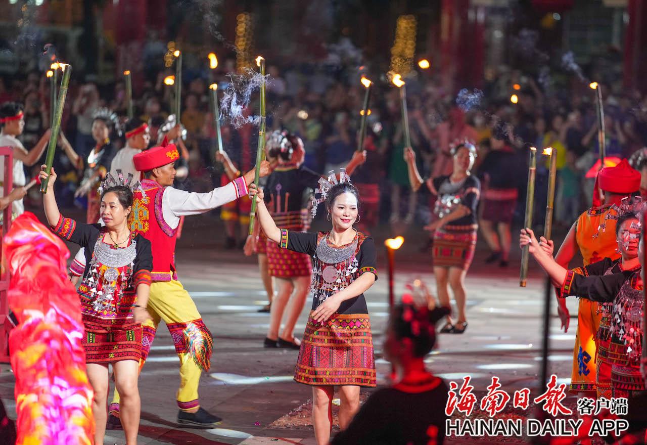 4月17日,在五指山市通什鎮(zhèn)的三月三廣場(chǎng),黎族群眾持火把跳起共同舞。海南日?qǐng)?bào)記者 李天平 攝