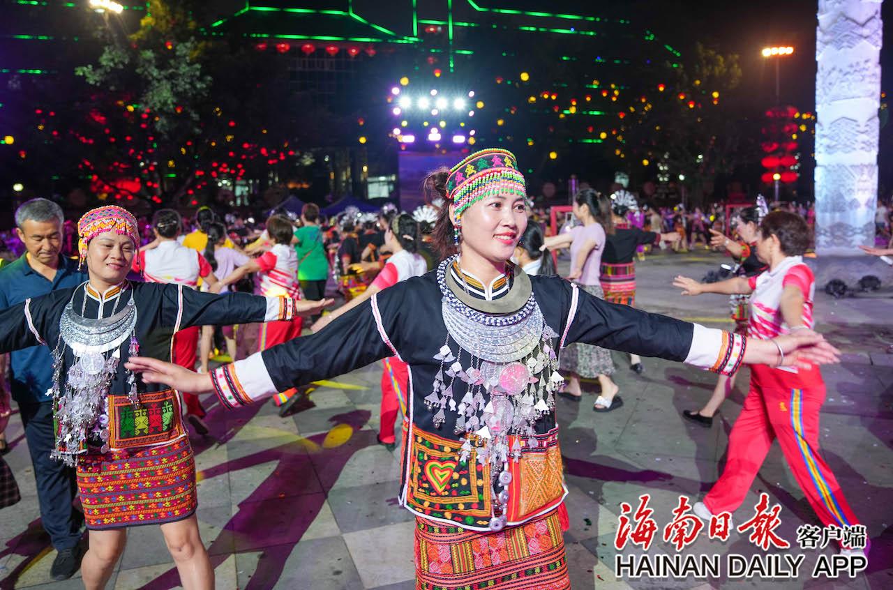 4月17日,在五指山市通什鎮(zhèn)的三月三廣場(chǎng),市民齊跳共同舞,歡慶“三月三”。海南日?qǐng)?bào)記者 李天平 攝