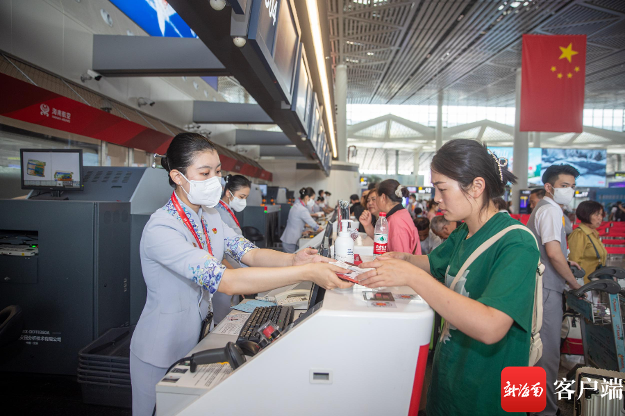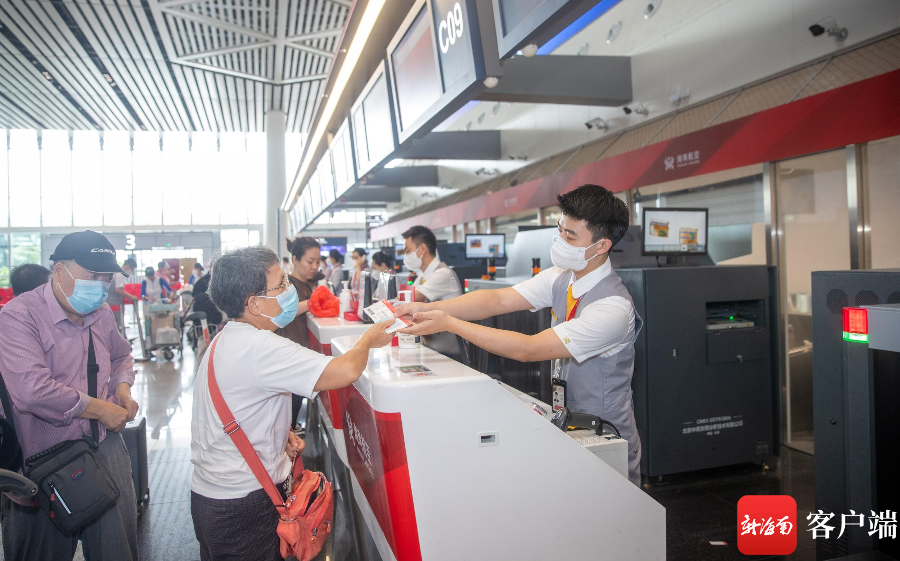 海南航空地面服務(wù)人員為旅客提供服務(wù)。記者 劉洋 攝