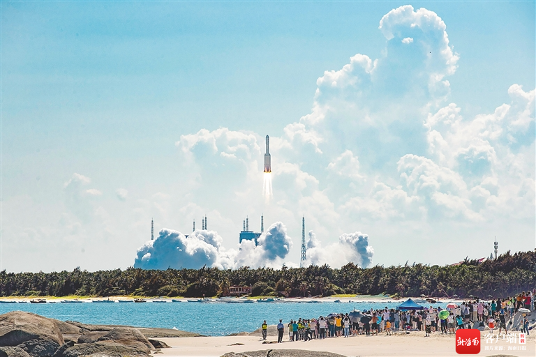 游客在文昌龍樓鎮海邊觀看火箭發射。