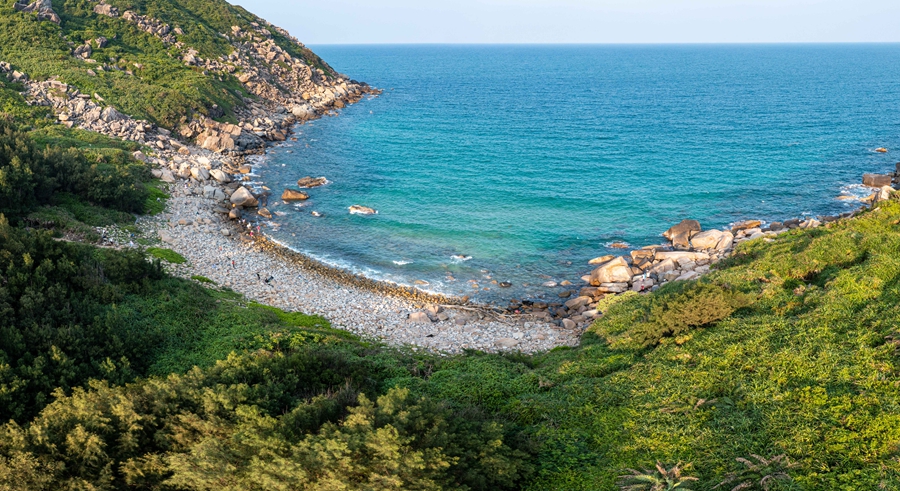 海水碧綠清澈與鵝卵石、巖石、綠植交相輝映。記者 劉洋攝