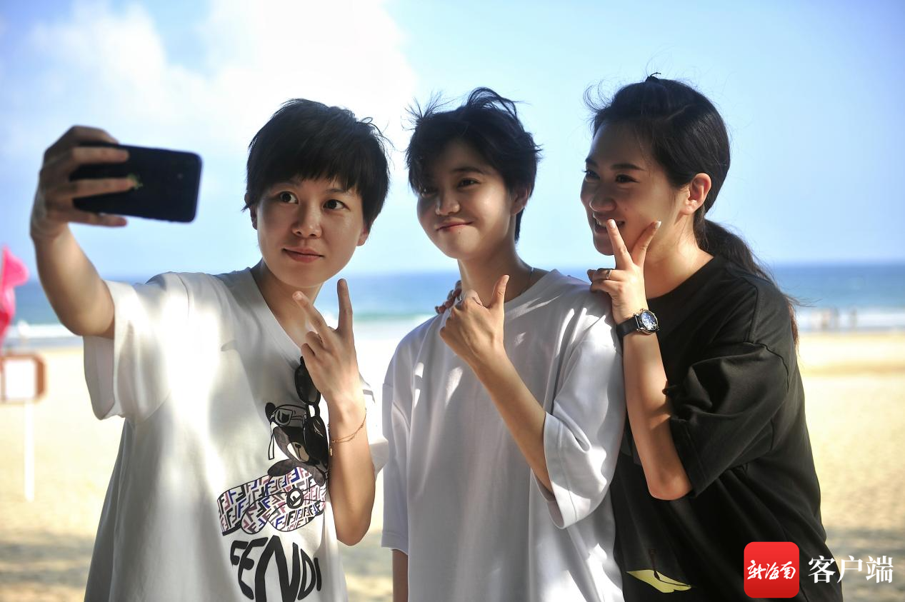 白鴿(左一)、韓雨(右一)、王曉彤(中)在石梅灣海邊自拍。賽事組委會供圖