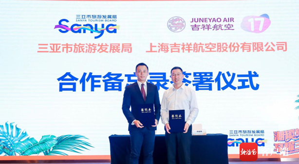 會上,三亞市旅游發(fā)展局與上海吉祥航空股份有限公司舉行合作備忘錄簽署儀式。上海吉祥航空股份有限公司于2006年9月正式開航運(yùn)營,于2017年5月成為星空聯(lián)盟全球首家“優(yōu)連伙伴”。未來,雙方將在航線拓展、產(chǎn)品開發(fā)、旅游營銷業(yè)務(wù)等方面展開深度合作,共同推進(jìn)三亞建設(shè)國際旅游勝地。